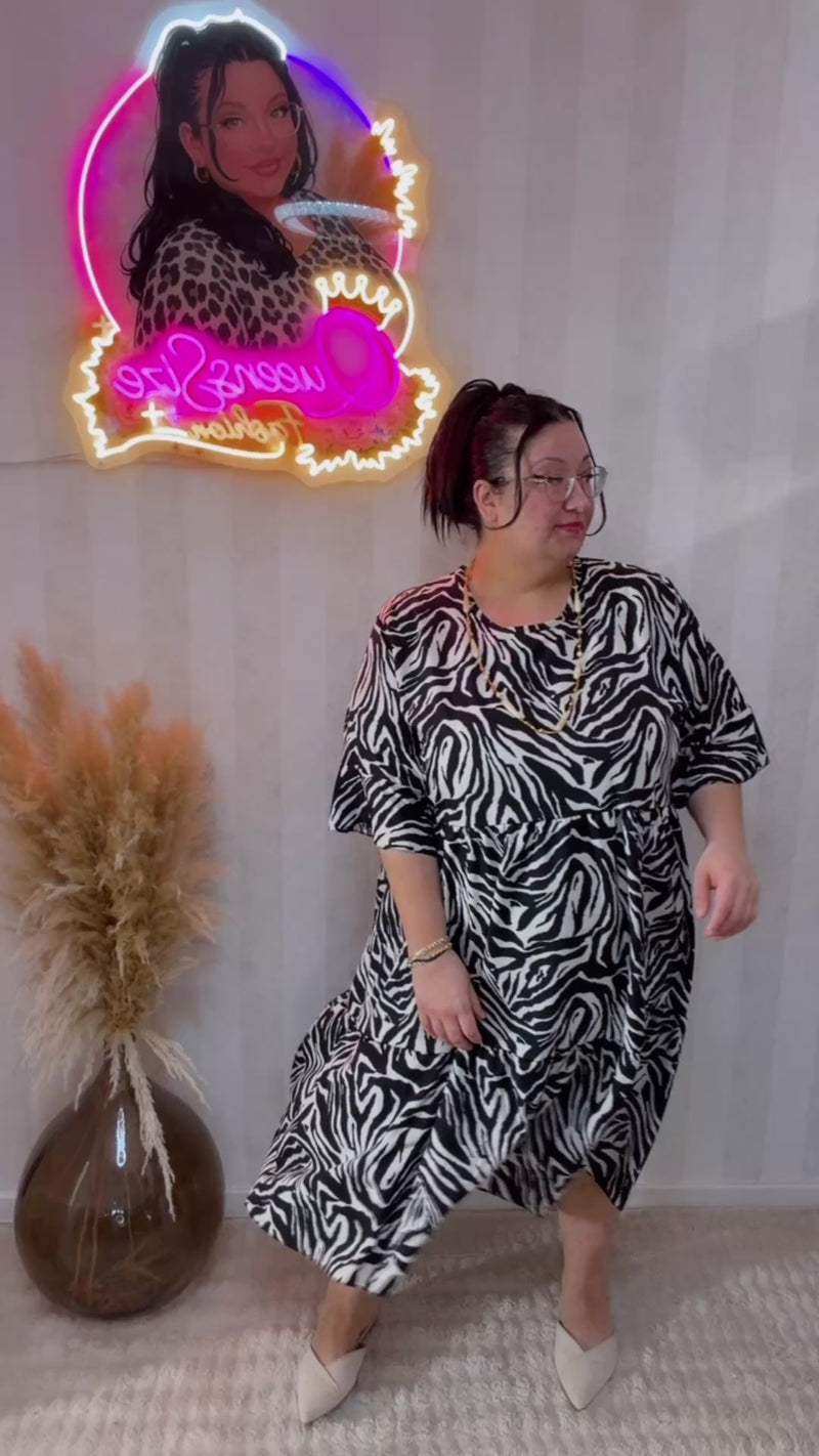 Wunderschönes Midi-Kleid mit modernem Print und lockerer, fließender Silhouette. Die 3/4-Volantärmel verleihen dem Kleid eine feminine Leichtigkeit, während der weich fallende Stoff für maximalen Tragekomfort sorgt. Ein unkompliziertes Wohlfühlkleid für Frühling und Sommer – einfach anziehen und stilvoll aussehen.