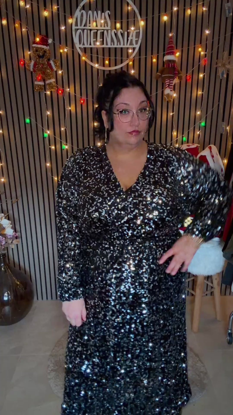 Das Maxikleid Scarlett Noir ist ein elegant fließendes Statement-Piece mit vollflächiger Pailletten-Bestickung. Die Pailletten sind auf der Innenseite unterlegt, wodurch ein angenehmes Tragegefühl ohne Kratzen entsteht. Die langen Ärmel mit Bündchenabschluss sorgen für stabilen Halt und eine definierte Passform. Der Schnitt ist schlicht, zeitlos und ideal für besondere Anlässe, festliche Einladungen und eindrucksvolle Curvy-Looks.